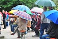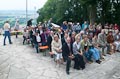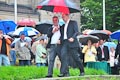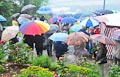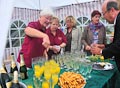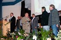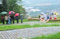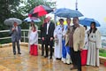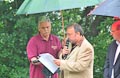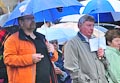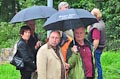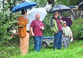 Durch Regenschirm geschützt trug zuerst BVG-Vorsitzender Günter Schuster seine Rede vor. Er bedankte sich namentlich bei allen freiwilligen Helfern, ohne deren beherztes und unermüdliches Arbeiten die Plattform nie hätte gebaut werden können. Ebenso bedankte er sich bei den ausführenden Firmen und den zahllosen Spendern, die zum Zustandekommen des Projekts einen großen Teil beigetragen haben. Er verwies auf die Gedenktafel am Anfang des Serpentinenwegs, die die Helfer und Unterstützer benennt. (Die komplette Rede ist übrigens weiter unten nachzulesen). Anschließend hielt Erster Bürgermeister Thomas Stadelmann eine kurze Ansprache, worin er das Engagement des Grabengärtenvereins besonders lobte und worauf er als Zeiler Bürgermeister sehr stolz sei. Natürlich bedankte er sich ausdrücklich bei Günter Schuster, dessen Idee die Aussichtsplattform war und der während der gesamten Bauphase die "Regie" führte und bei dem alle Fäden zusammenliefen. Dann konnte der katholische Stadtpfarrer Stephan Schwab die Segnung des Bauwerks vornehmen, wetterbedingt etwas kürzer, als man es erwartet hatte (worauf er selbstironisch hinwies).