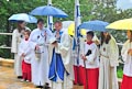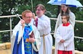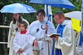 So viel Segen von oben wäre gar nicht nötig gewesen! Das Weihwasser unseres Herrn Stadtpfarrers Schwab hätte durchaus gereicht, und auf den Regen hätten wir heute mal gerne verzichtet. Pünktlich zum Beginn der Einweihungsfeier fing es an zu tröpfeln und hörte bis zum Ende auch nicht mehr auf. Aber da man am Wetter bekanntlich wenig ändern kann, muss man eben das Beste daraus machen. Und so wurde es trotz allem eine würdige, dem gelungenen Bauwerk angemessene Einweihungsfeier.